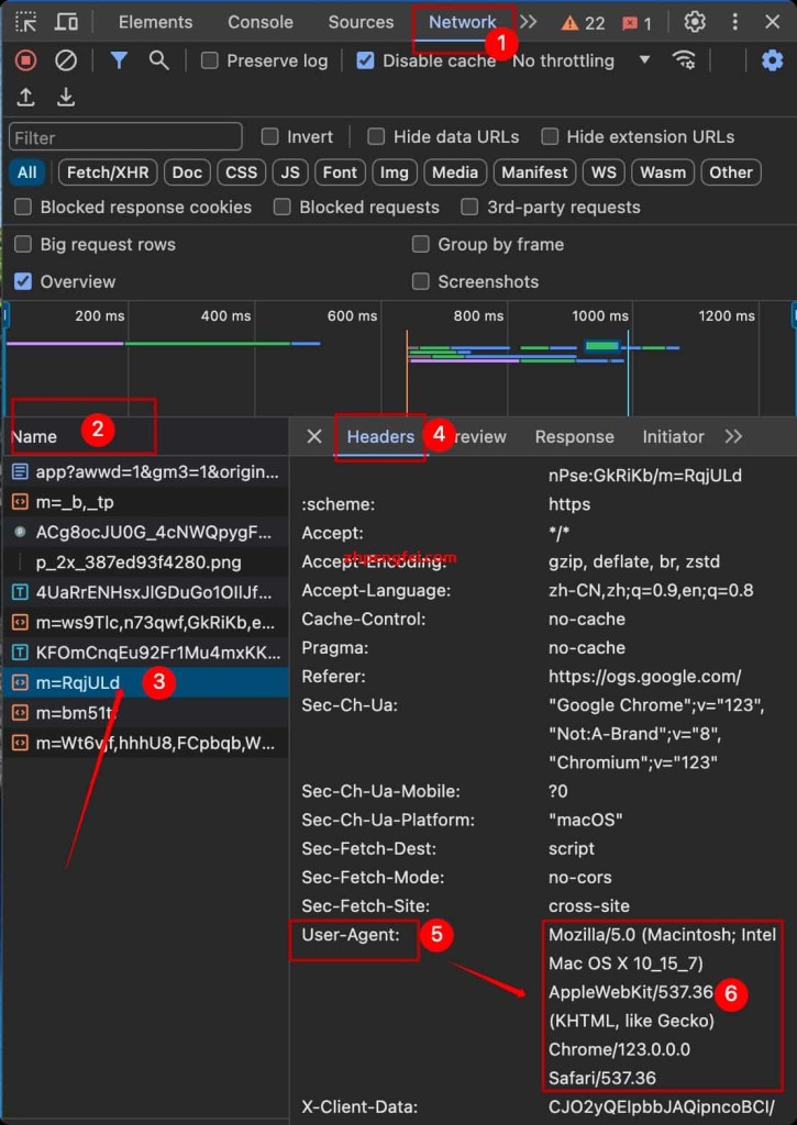 随便打开一个网页,按 F12,选择 Network -左侧Name栏随便点击一个,点击右侧 Header,向下滑找到 User-Agent 简称 UA,这是真实 UA,很多人胡编乱造的 ua,访问量大的情况很容易被封,大家也可以直接复制我这个Mozilla/5.0 (Macintosh; Intel Mac OS X 10_15_7) AppleWebKit/537.36 (KHTML, like Gecko) Chrome/123.0.0.0 Safari/537.36