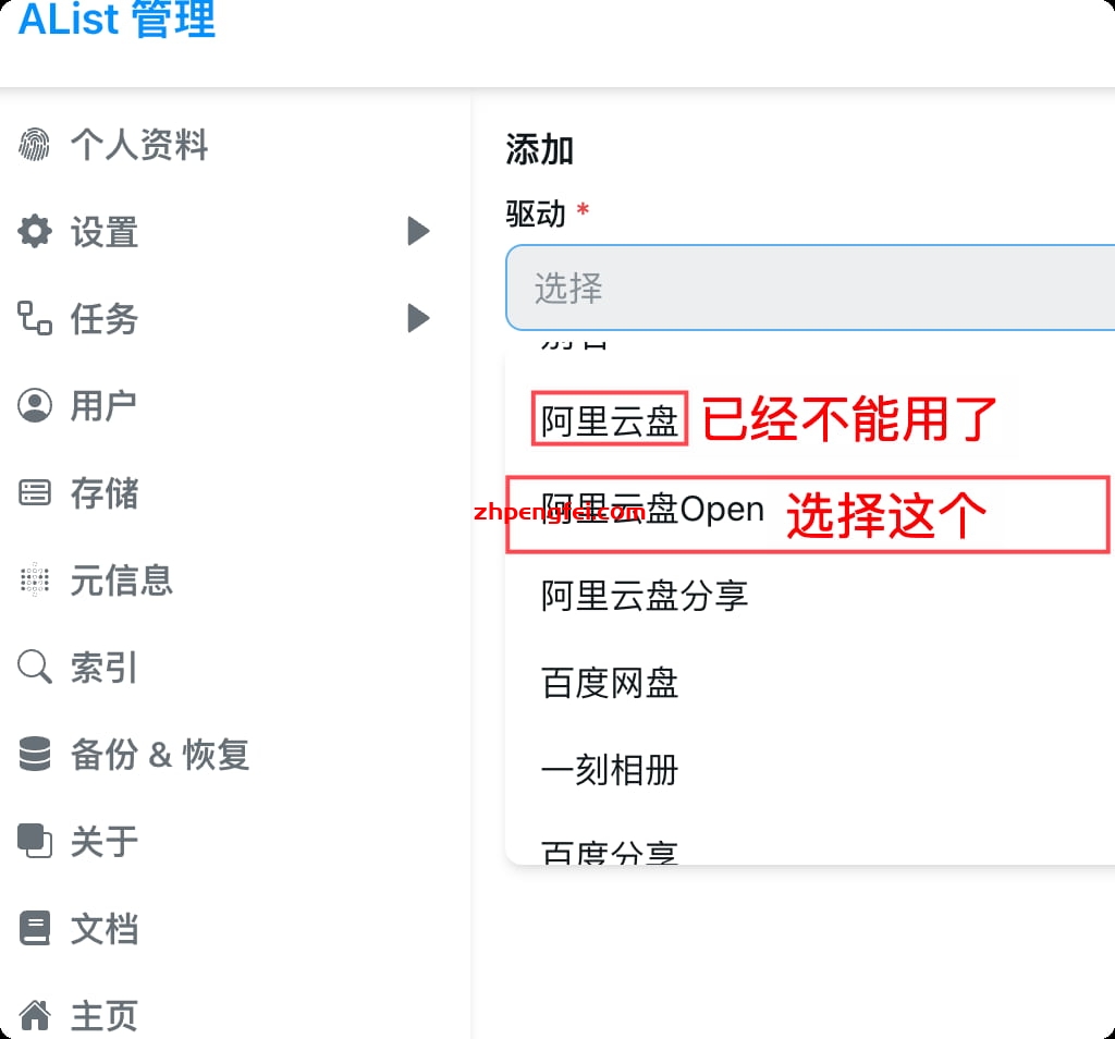 2、驱动选择阿里云盘Open,不要选择阿里云盘,