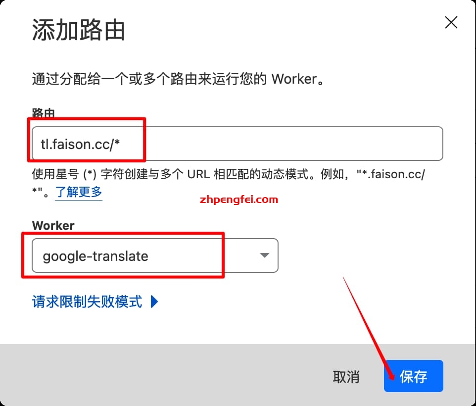 3.4、路由:tl.faison.cc/* Worker选择 google-translate,最后点击保存。