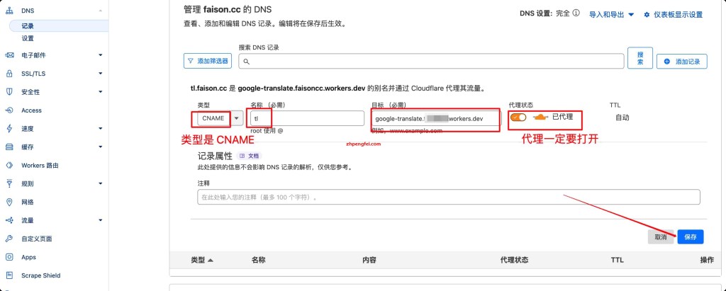 3.2、类型选择 CNAME,名称输入 tl,目标是 worker地址: google-translate.xxx.workers.dev(替换成你的),代理状态默认是打开,不要关闭,最后点击保存即可。